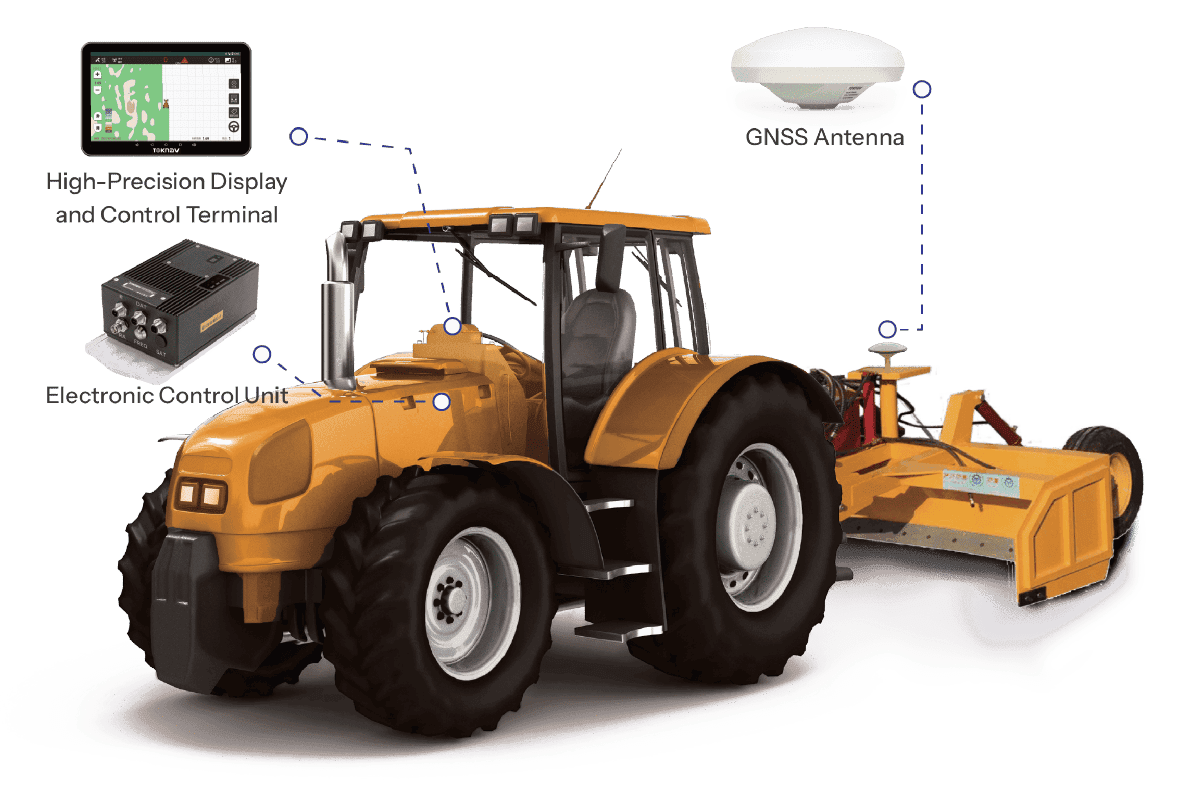 The system includes tractor navigation, and is compatible with telescopic, ripper, paddy leveling blades, scrapers, and graders.